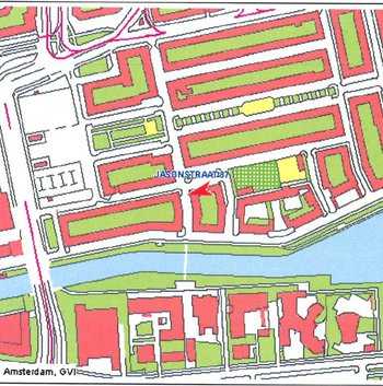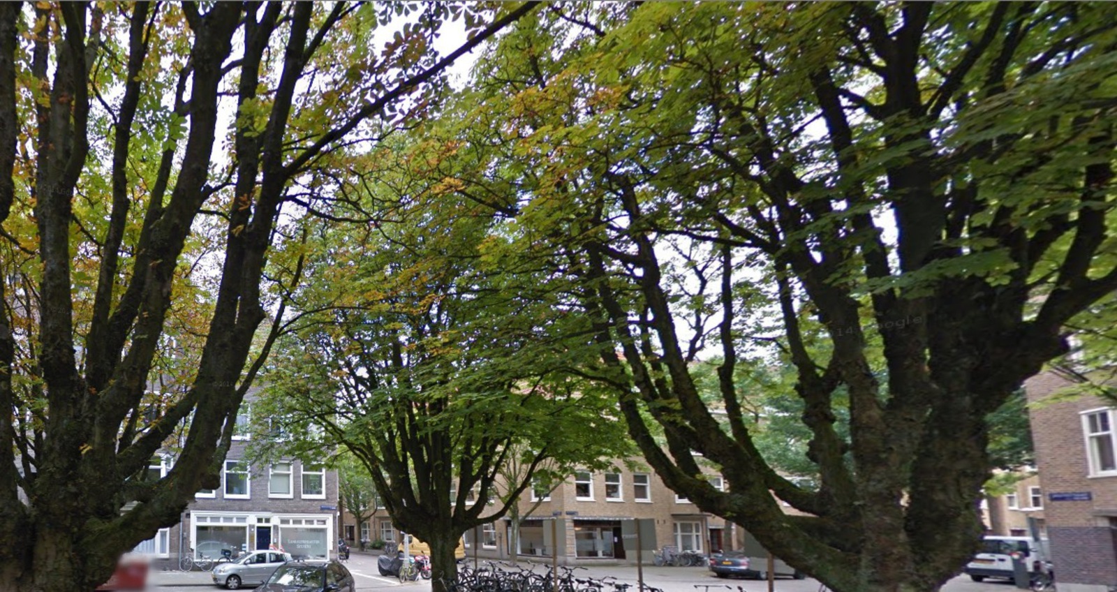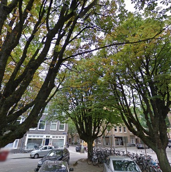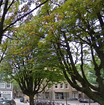 Jasonstraat y la pequeña plaza con monumentales castaños blancos.